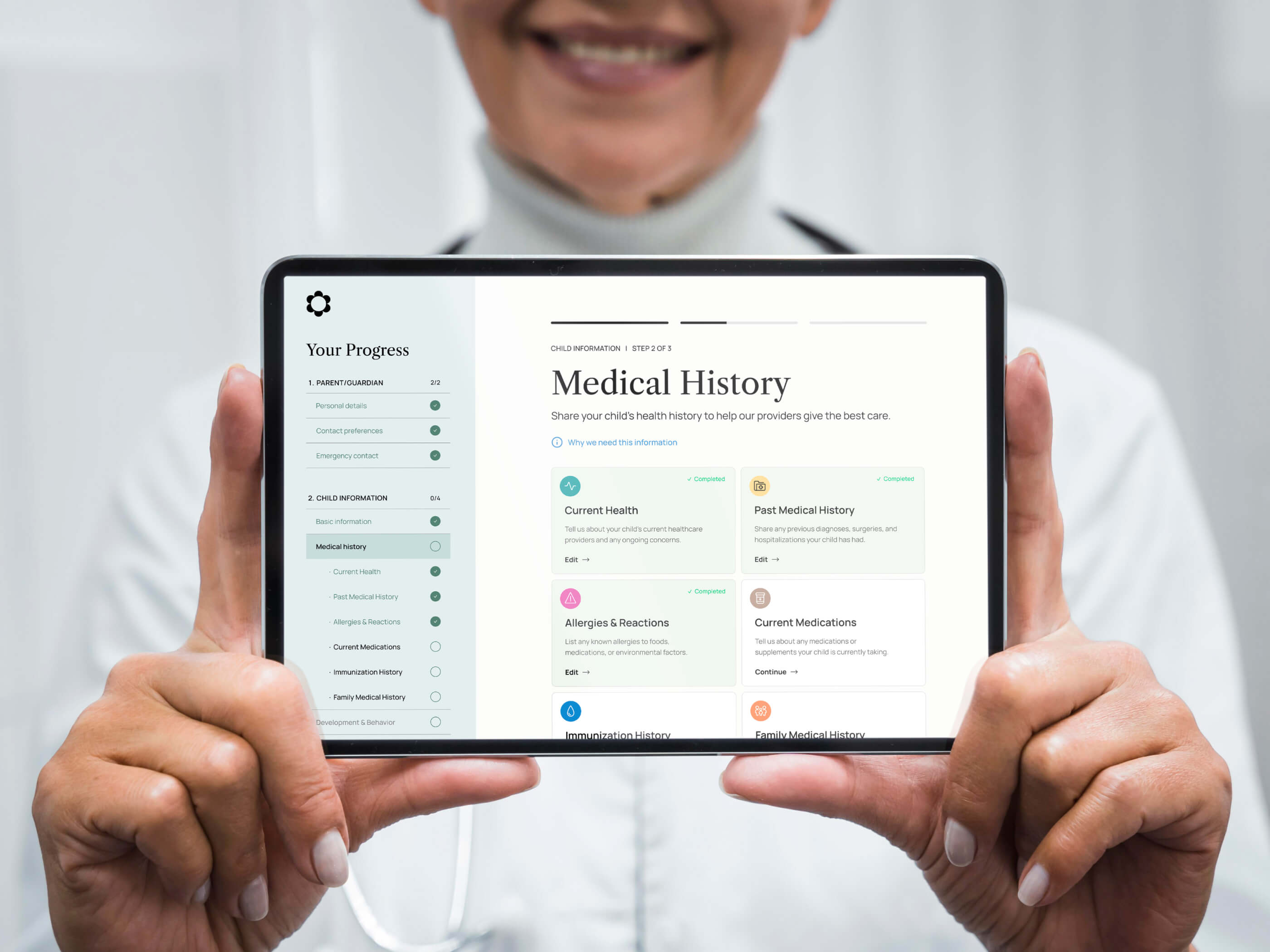 It’s all essential before a doctor can see the child, but the reality is that no parent sits down calmly at 8 PM with a cup of tea and fills out 12 screens of forms.